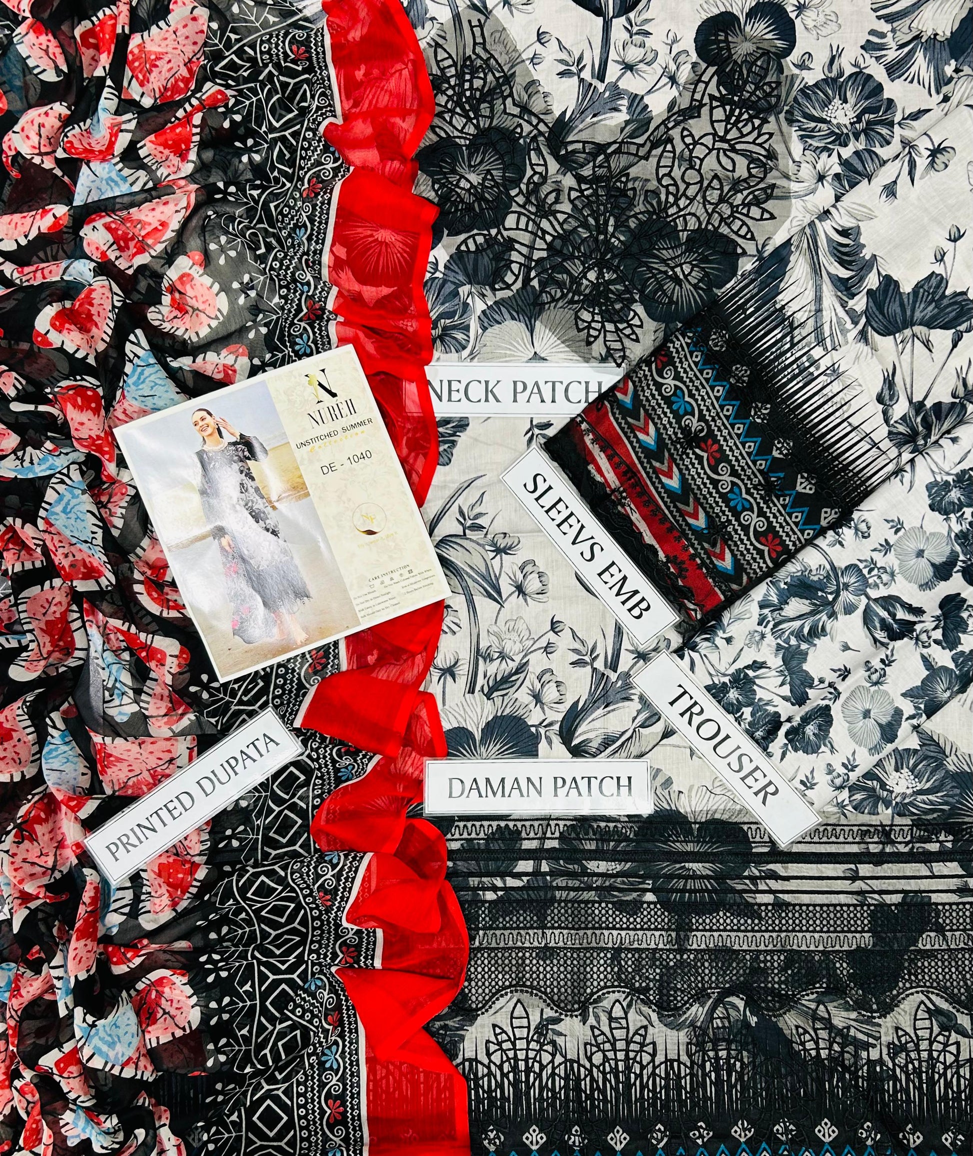printed lawn front with heavy embroidered scifflie neckline with heavy embroidered spengle work daman boarder